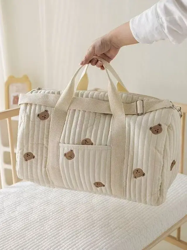 Bolso maternal c/bordadoMaterial: AlgodónMedidas 48 x 24 x 28 cm